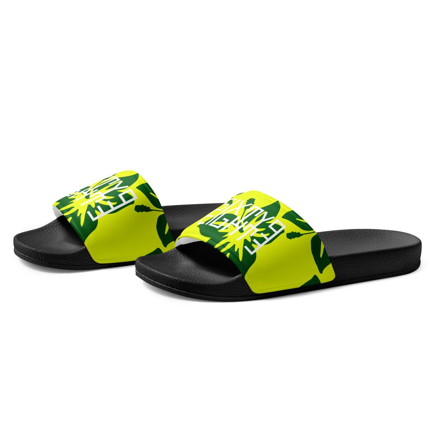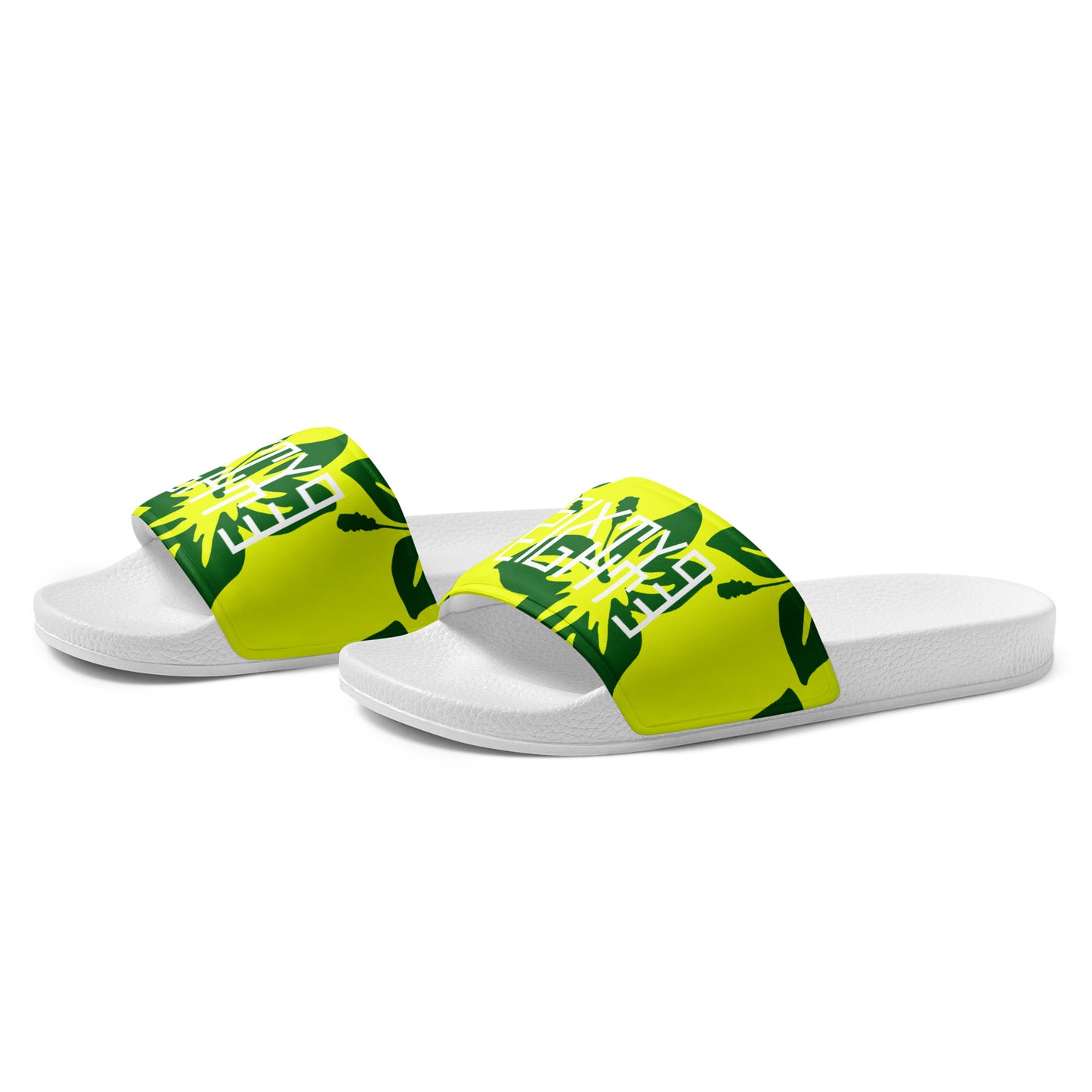 Sixty Eight 93 Logo White Hibiscus Forest Green & Yellow Men’s Slides