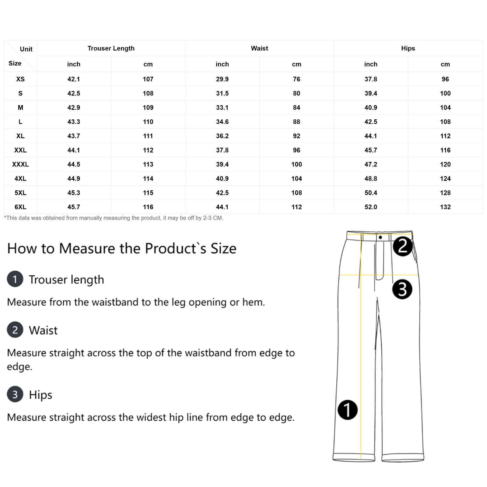 | Size | Trouser Length (CM) | Waist (CM) | Hips (CM) |