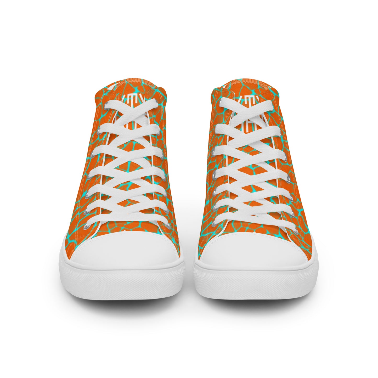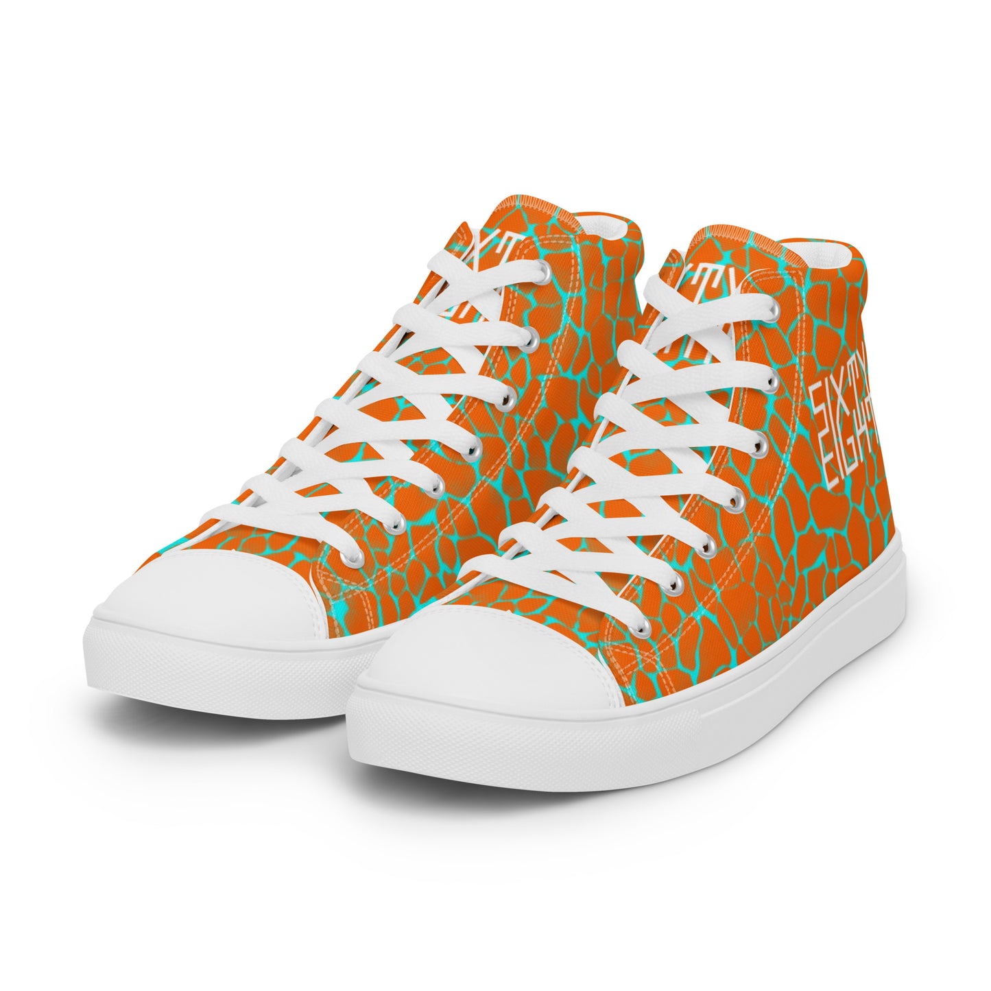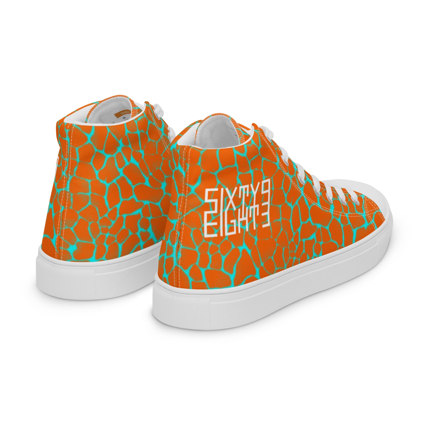 Featuring a orange and aqua blue boa print design. Step up your shoe game with the High Top SixtyEight 93 Shoes. These handmade, trendy shoes are sure to spice up your outfit. Get yours now!