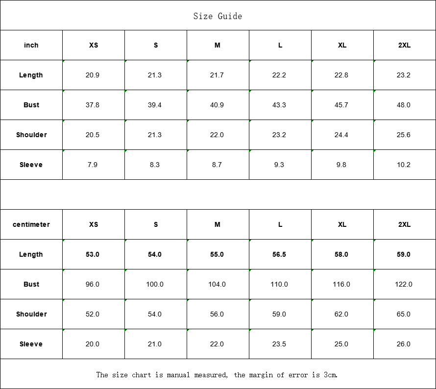 | Sleeve | 20.0 | 21.0 | 22.0 | 23.5 | 25.0 | 26.0 |