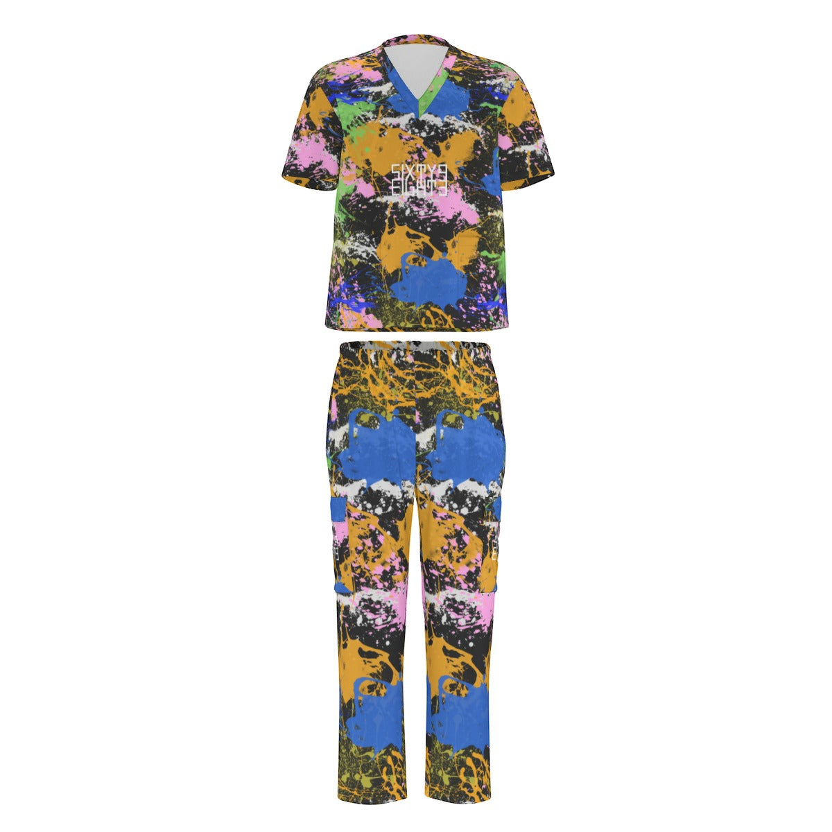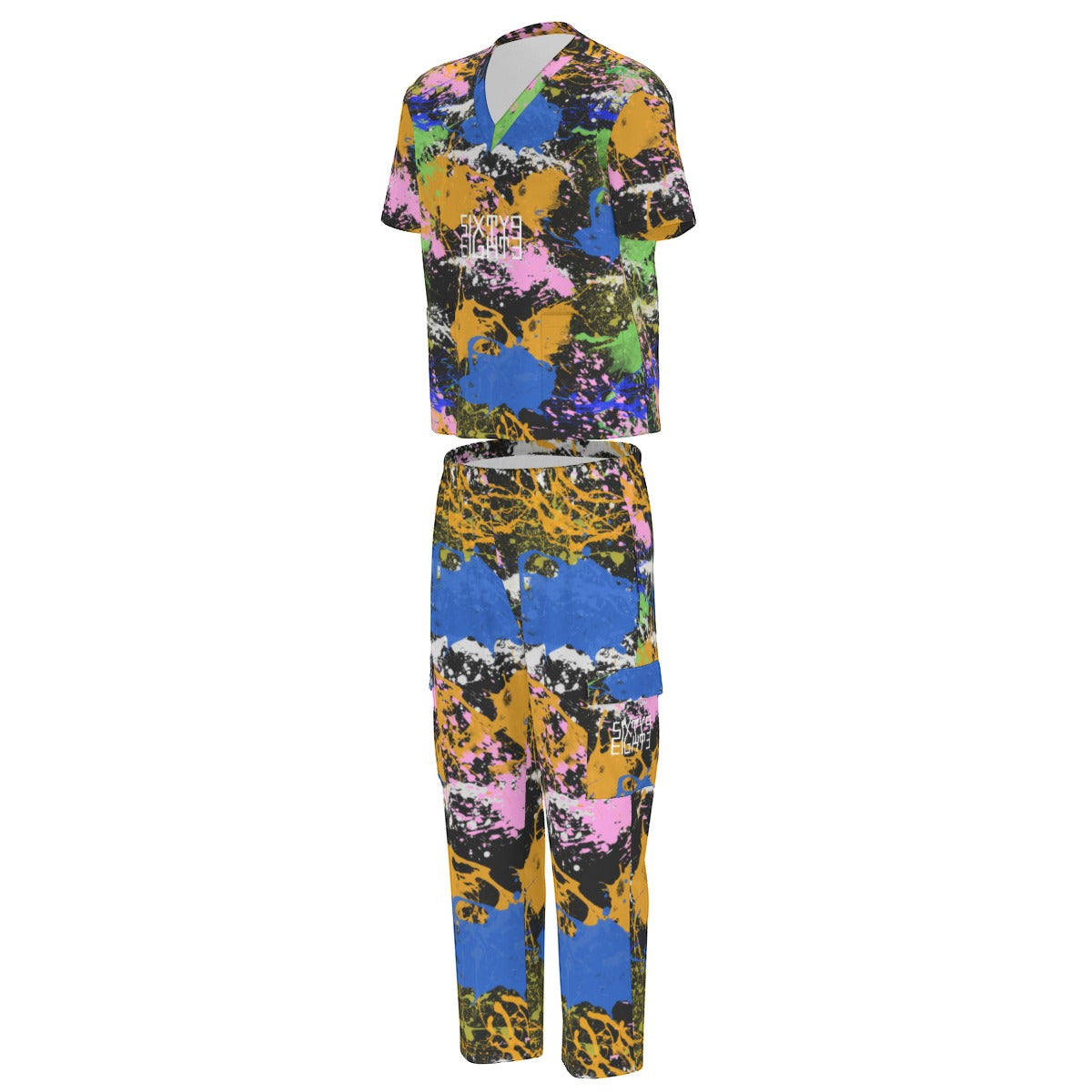 Sixty Eight 93 Logo White Splatter #2 Unisex Scrub Set With Six Pockets