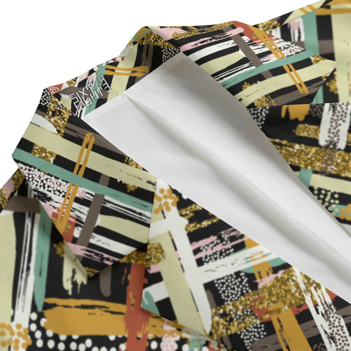 Introducing the Sixty Eight 93 Logo White & Black Blazer #34 - a sophisticated and exclusive addition to your wardrobe. Made from high-quality cotton, its unique geometric paint splotches add a touch of artistry to your look. Experience luxury and style with this multicolor blazer, featuring a flat lapel collar.