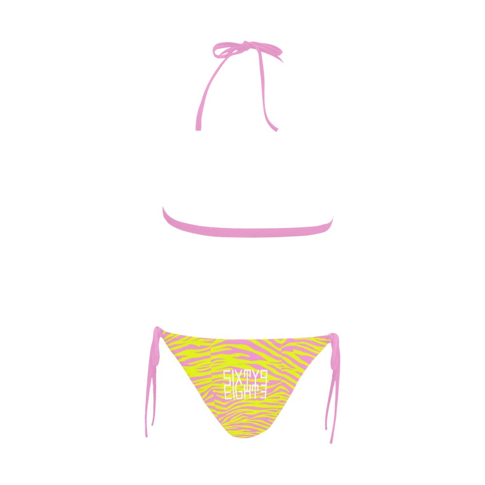 Sixty Eight 93 Logo White Zebra Pink Lemonade Halter Bikini Swimsuit